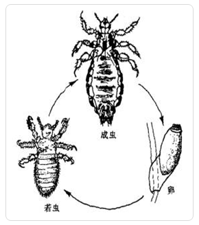 虱的发育过程:虱的发育属不完全变态,生活史中有卵、若虫和成虫三期(见图2-6-5“虱的生活史”)。雌雄交配后雄虱即死亡,雌虱于2~3天后开始产卵,每虱一昼夜产卵1~4枚。卵黄白色,长椭圆形,黏附于家畜被毛上。卵经9~20天孵化出若虫,若虫分三龄,每隔4~6天退化一次,第三次蜕皮后变为成虫。雌虱产卵期2~3周,共产卵50~80枚,卵产完后即死亡。